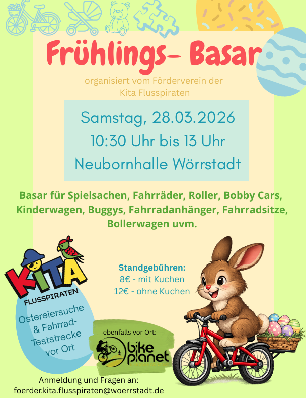 Am Samstag, 28. März 2026, findet in der Kita Flusspiraten ein Frühlings-Basar statt. Der Förderverein der Kita freut sich über rege Teilnahme.